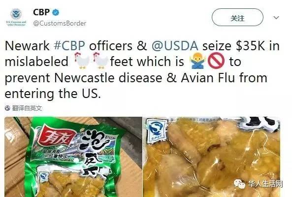 近日,一名华裔携带为数可观的“有友泡凤爪”过新泽西纽瓦克海关时被没收,价值3万5千美元,海关给出的原因是“为了防止禽流感,鸡爪不能带入境”,必须全部没收。
