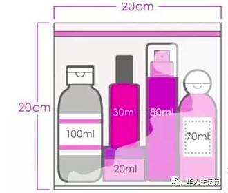 手提行李中的液体、喷雾剂或发胶容器,大小必须等于或小于100毫升。所有容器必须密封装入容量为一升的透明塑料袋中,每人限带一个塑料袋。塑料袋容量不得超过1升,即大约为20X20厘米或15X25厘米。