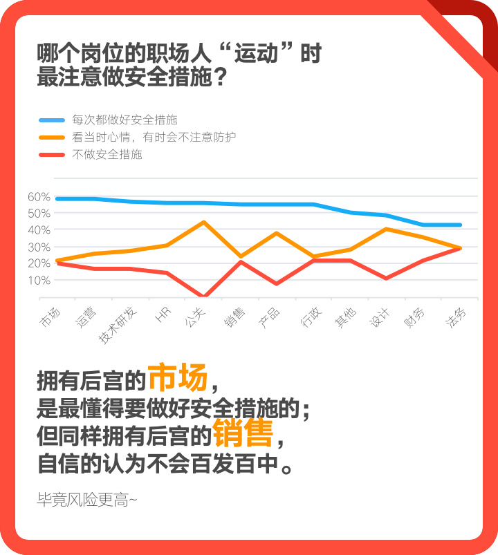 从职业角度看,市场、产品、公关、财务、运营表示在性生活上很受岗位影响;行政、技术研发、销售的性生活则不怎么受影响。引人好奇的是,技术研发这个过劳死高发和频发的岗位,居然表示性生活不受岗位影响。究其原因,原来是技术研发岗位的职场人,对性生活的需求不如其他职业旺盛,对性生活也不向其他职业挑剔,寥胜于无,容易满足。