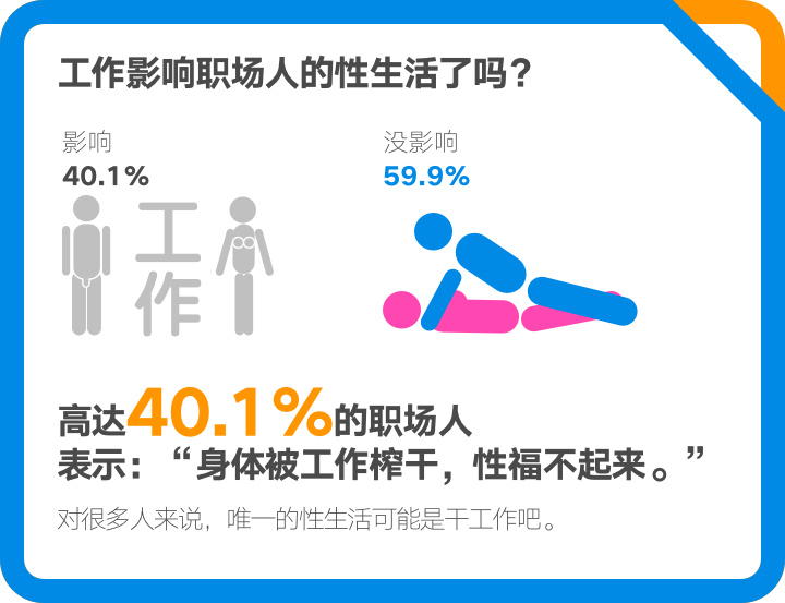 调查显示,40.1%的职场人表示,自己的职业和工作,已经影响到了自己的性生活。一部分人因为经常加班,累得影响性爱质量,甚至累得没性趣;另一部分表示出差频繁,聚少离多,很影响与伴侣的性生活;还有一些人称因为工作两地分居,十分影响。