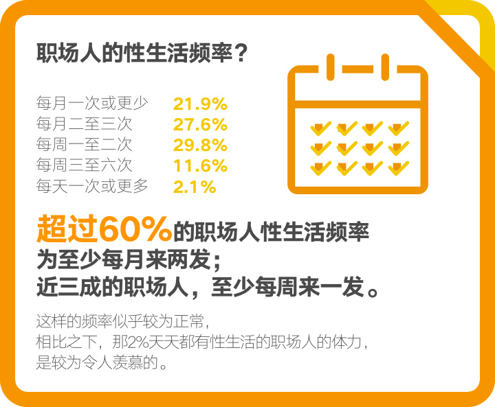 快节奏的都市生活、高强度的工作节奏背景之下,职场人性生活满意度数据,与较高的工作生活压力,日渐变得密不可分。