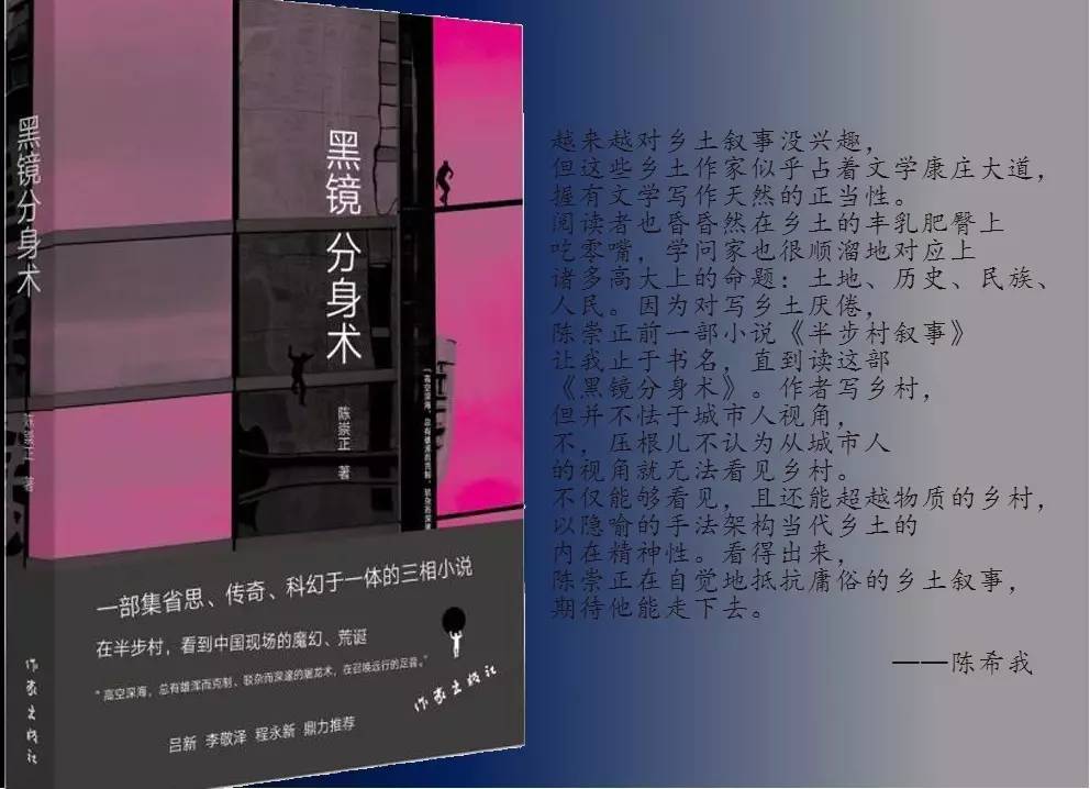 这次研读广东本土作家陈崇正《黑镜分身术》。这本集子里的文章我以前也没读过,读完之后,它更新了我对于陈崇正小说的印象。之前的《半步村叙事》《我的恐惧是一只黑鸟》都看过,还写过短评。对于《半步村叙事》,我觉得很乡土,很会讲故事,但是思想性还是欠缺了些;对于《我的恐惧是一只黑鸟》,我曾说这个恐惧主体很值得写,但很多篇并没有写出真正的恐惧,大多为具体的、零碎的恐惧,而没很好地抓到我们内心深处那些最关键的恐惧,对此我表示过遗憾。这次的《黑镜分身术》,我阅读的时候就在感慨,陈崇正并没有那么简单,这个集子里的文章融汇了他的乡土写实与恐惧挖掘,或许更能代表他至今为止比较理想的写作风格和思想能量。