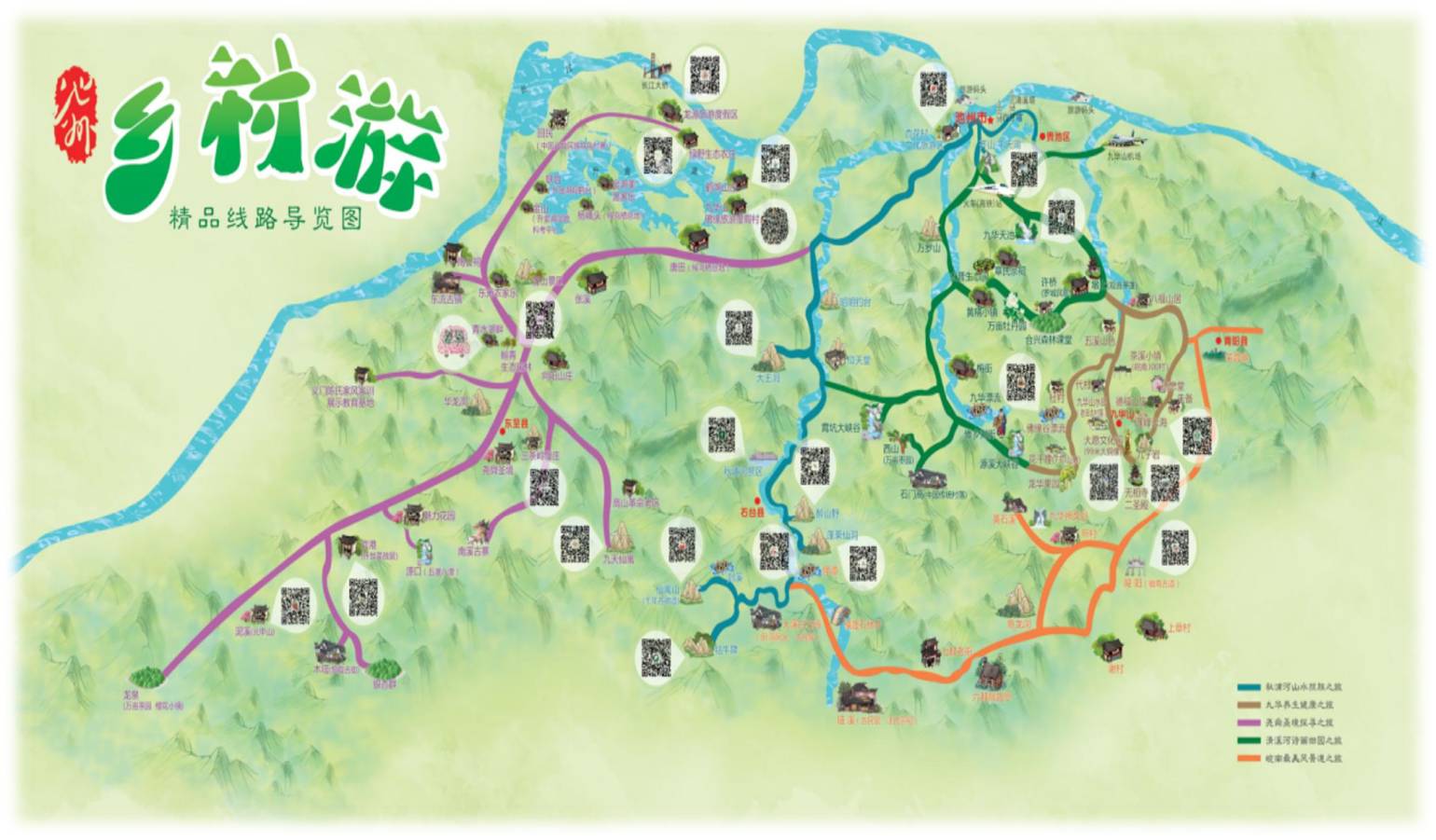 为使大家更加直观的感受这5条线路的分布情况,市旅发委还特地制作了《池州乡村游精品线路导览图》,采用手绘的方式展示给大家,5条线路分5种不同颜色进行标注,每条线路的重要节点都放置了二维码,扫一扫,各个点上的具体资源情况介绍立马呈现,手法新颖,创意独特。