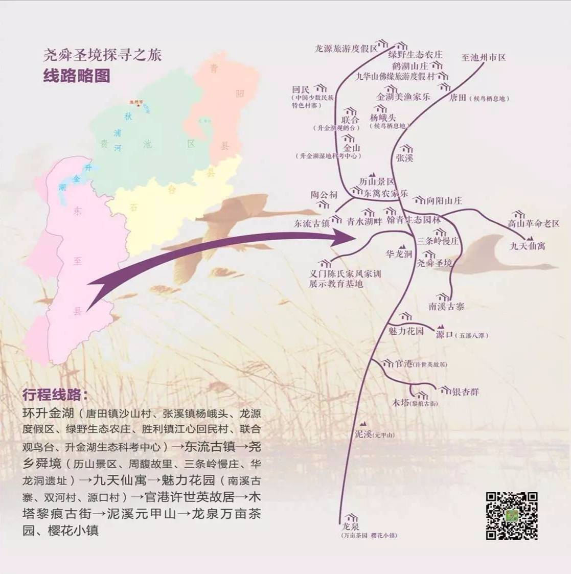 升金湖→东流古镇→尧乡舜境→九天仙寓→南溪古寨→许世英故居→木塔黎痕古街→泥溪元甲山→龙泉万亩茶园、樱花小镇
