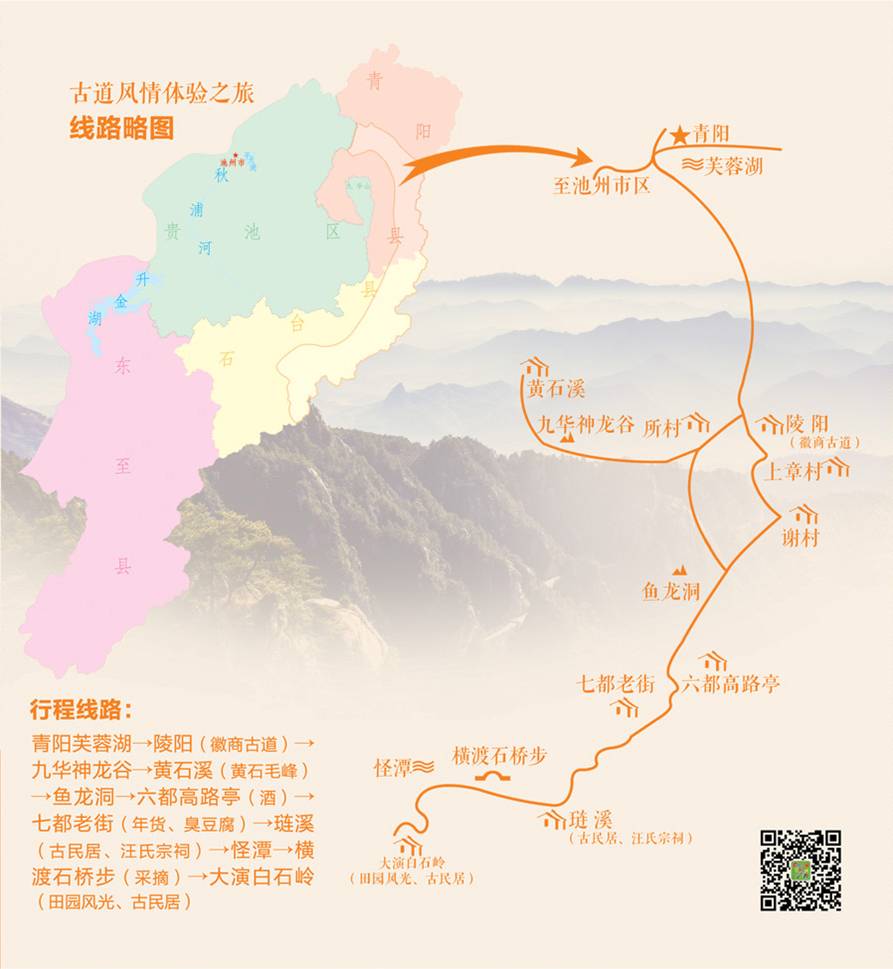 这条线路是以流淌着诗的河流——秋浦河为主线,以自然山水为特色,有山、水、村、洞、茶。