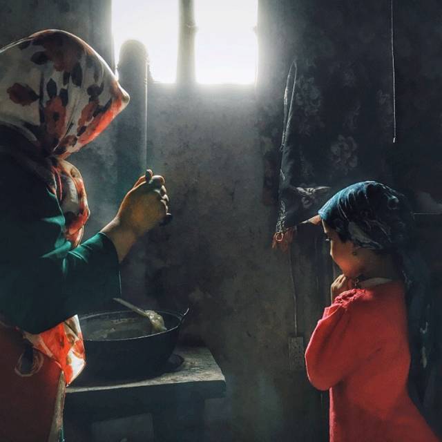 妈妈做好了美味的饭菜。从小女孩攥紧的小手、鼓起的脸颊上,我们仿佛能感受到那种雀跃的心情。