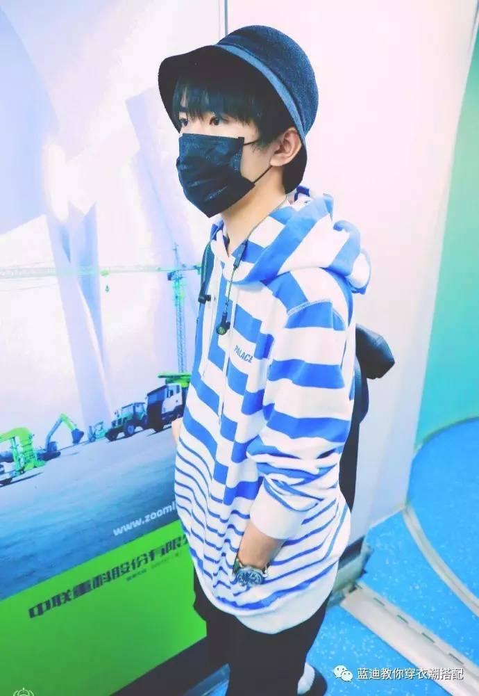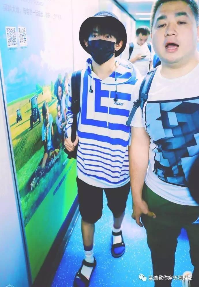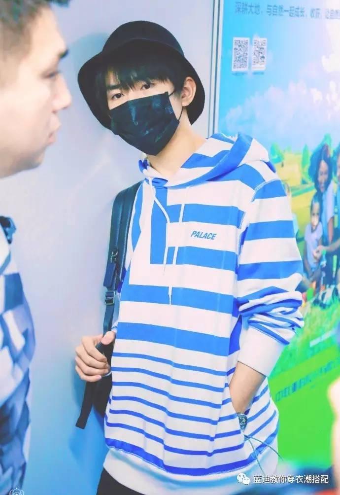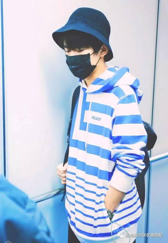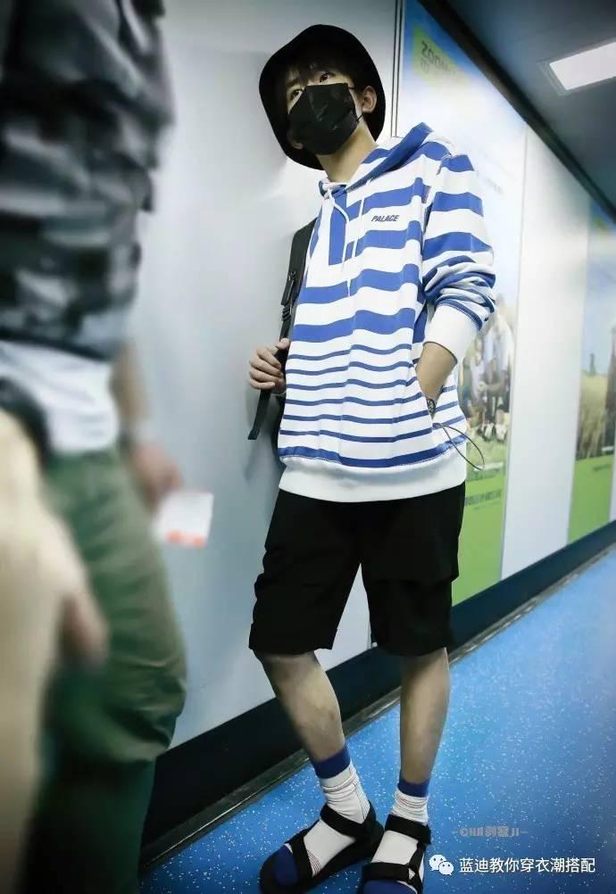 易烊千玺北京机场街拍,他身穿蓝白条纹卫衣,渔夫帽,凉鞋+长袜,时尚品味超赞,一个走在时尚界的boy~