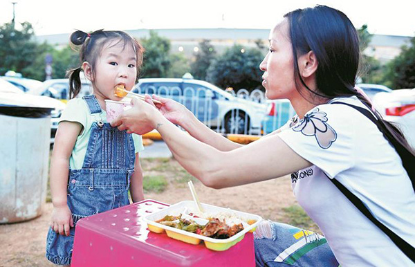 在天河机场候客时,母女俩在路边买饭充饥。 本文图均为 楚天都市报 图