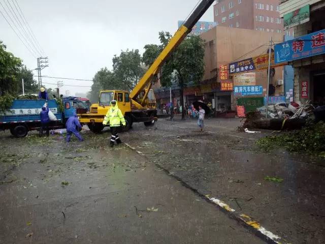 强风之下,一棵棵树木被吹翻、折断,道路一篇狼藉。 市政、城管工作人员冒着狂风暴雨也行动起来,积极投入到抢险之中。市政部门投入清障车对路边倒下大树进行紧急清障。