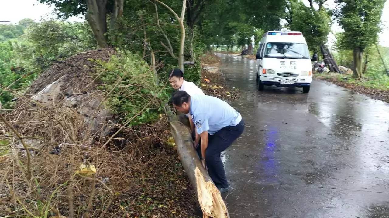 三水,被吹断的大树横在路中间,3000多斤的大树,民警二话不说,马上到场清理。