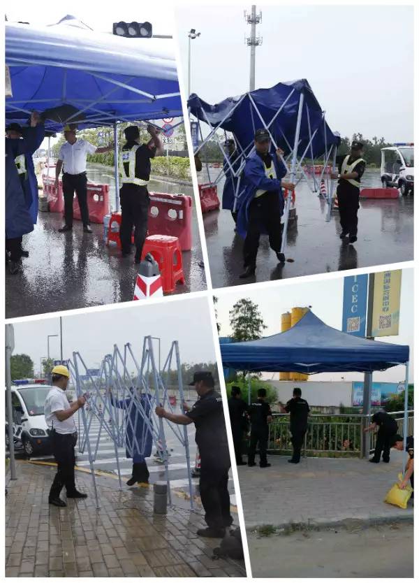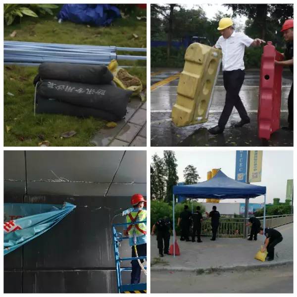 后勤人员将沙袋搬运到位,收回水马帐篷等设施,拆除高空广告灯布……消除可能因台风天气带来的安全隐患。