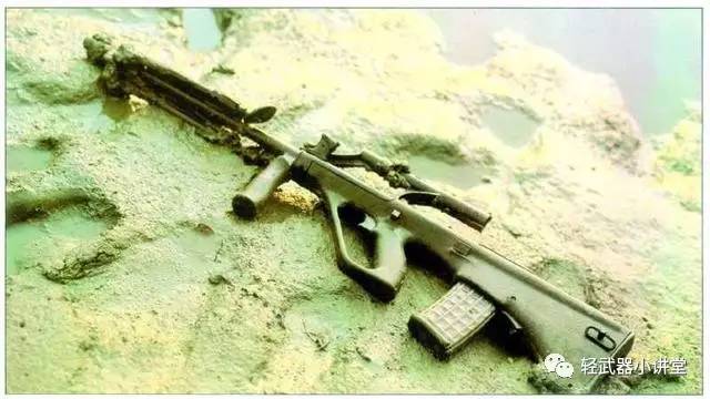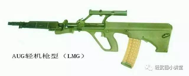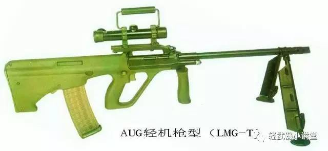 斯太尔AUG轻机枪型于1978年首次出现,于1980年代初列装,主要有两种型号,即LMG型和LMG-T型。