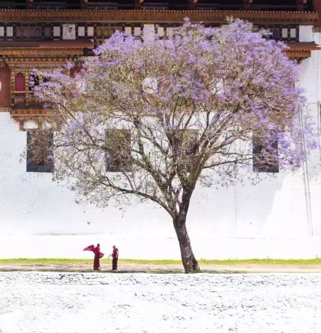 藏红纯白相间的寺庙矗立在河道旁的鹅卵石滩上,远处喜马拉雅山脉上皑皑的白雪随着春天温暖的阳光融化,河流旁、寺庙边,一棵棵有着高大挺拔的蓝花楹树,花开如云。