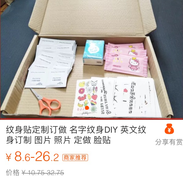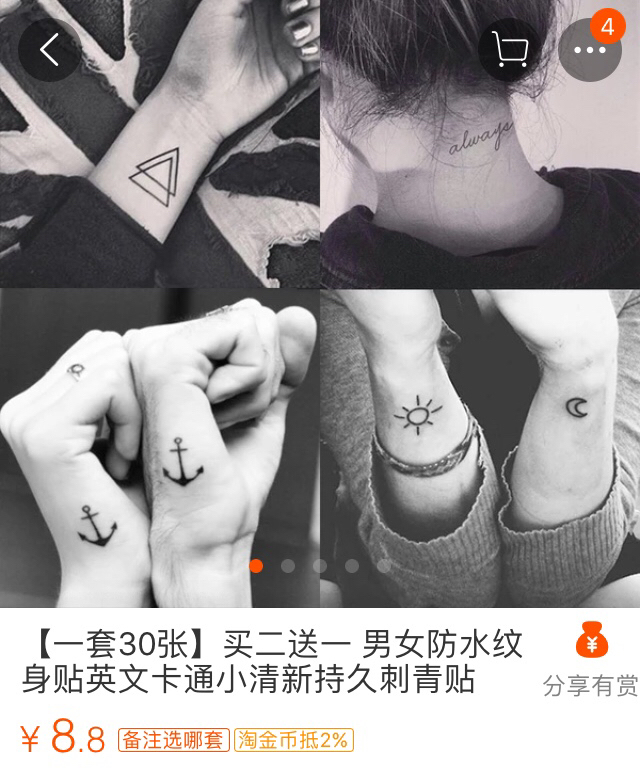 最近不是要七夕了吗,记得分享给闺蜜啊男朋友啊什么的哦!一起买个纹身贴来秀恩爱也是极好的。