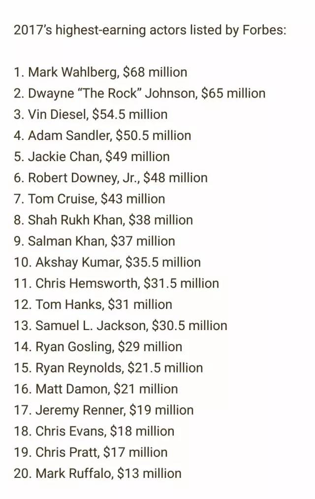 公布了年度全球男演员收入排行榜单。