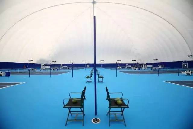 这座网球馆的最大亮点,就是采用新兴的气膜结构,巨大的白色气膜覆盖整个网球场地,远望过去像一只匍匐的“巨龟”,气膜本身是透光设计,白天整个场馆都显得非常敞亮。球馆周围铺设网状的限制绳,以防气膜过度膨胀。