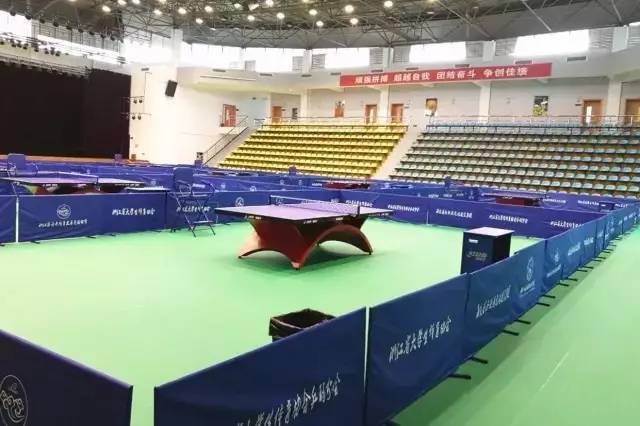 今年暑假,场馆建设的工作重心转移到了比赛球台的布置和地胶的铺设上。场馆内地胶的颜色是绿色的,与乒乓球比赛常见的红色地胶不同。学院负责老师解释道,这种绿色的地胶在伦敦奥运会上也使用过,性能和材质都是最顶级的。比赛的球台也是红双喜的世锦赛标准比赛球台,是可以承办国际级比赛的球台。