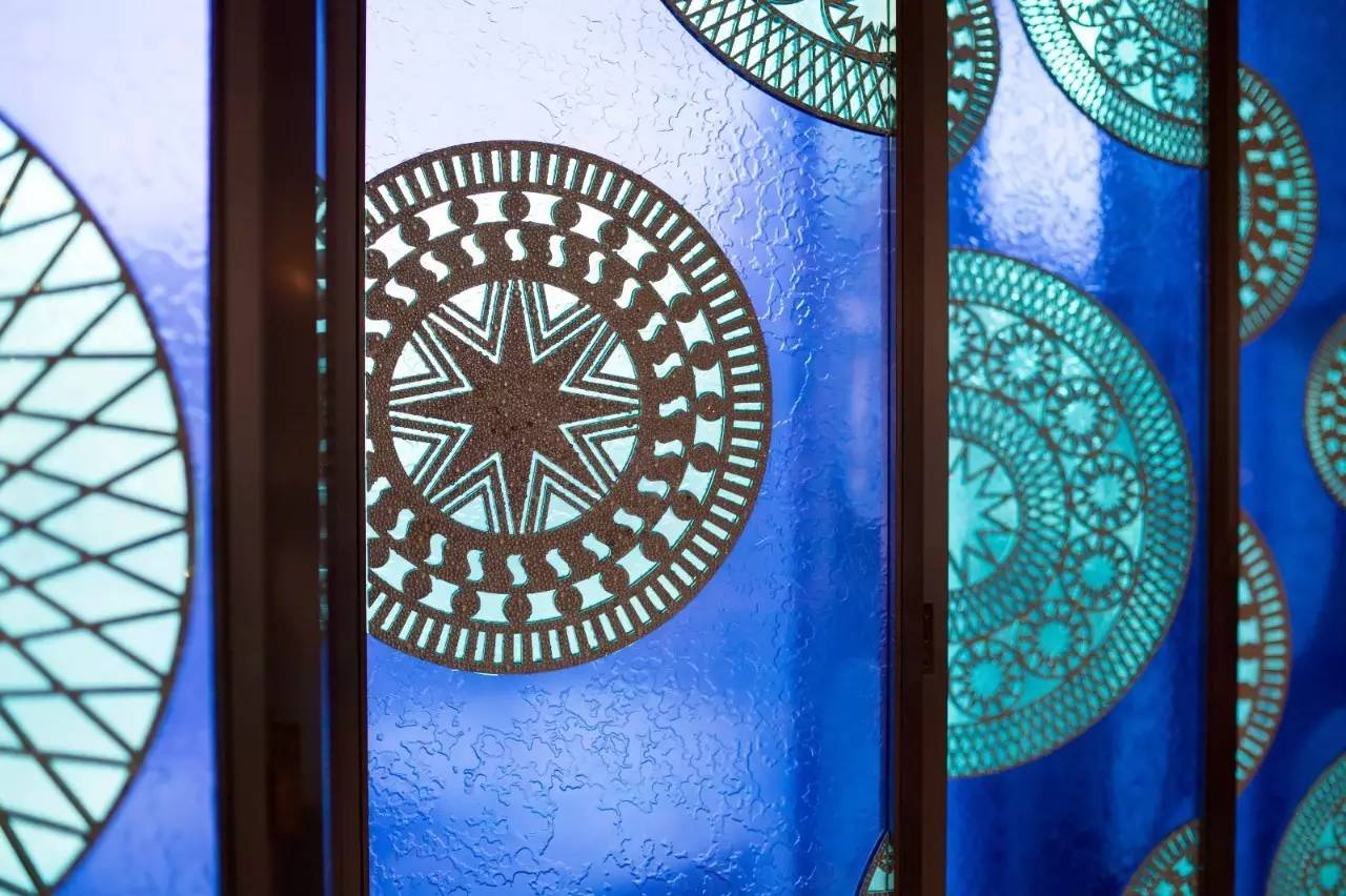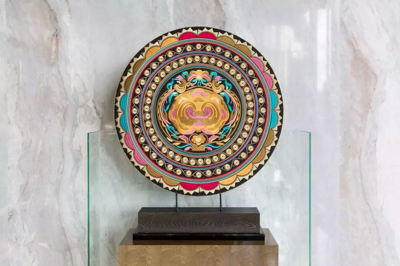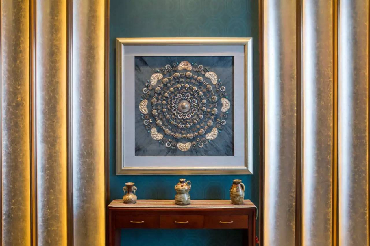 缀满水晶的屏风也用的是铜鼓的造型,时尚而特别。