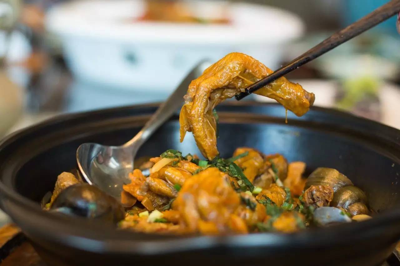 田螺鸭掌煲,这一道菜让全场爱吃酸的女士不顾形象只顾埋头而吃,可见它的魅力。田螺、芋头、酸笋、皮酥肉嫩的鸭掌在一起相亲相爱,怎能不好?!南宁人吃完会让老板再加几份鸭掌进去,啃着鸭掌,吮着田螺,吹着小风,美不美?
