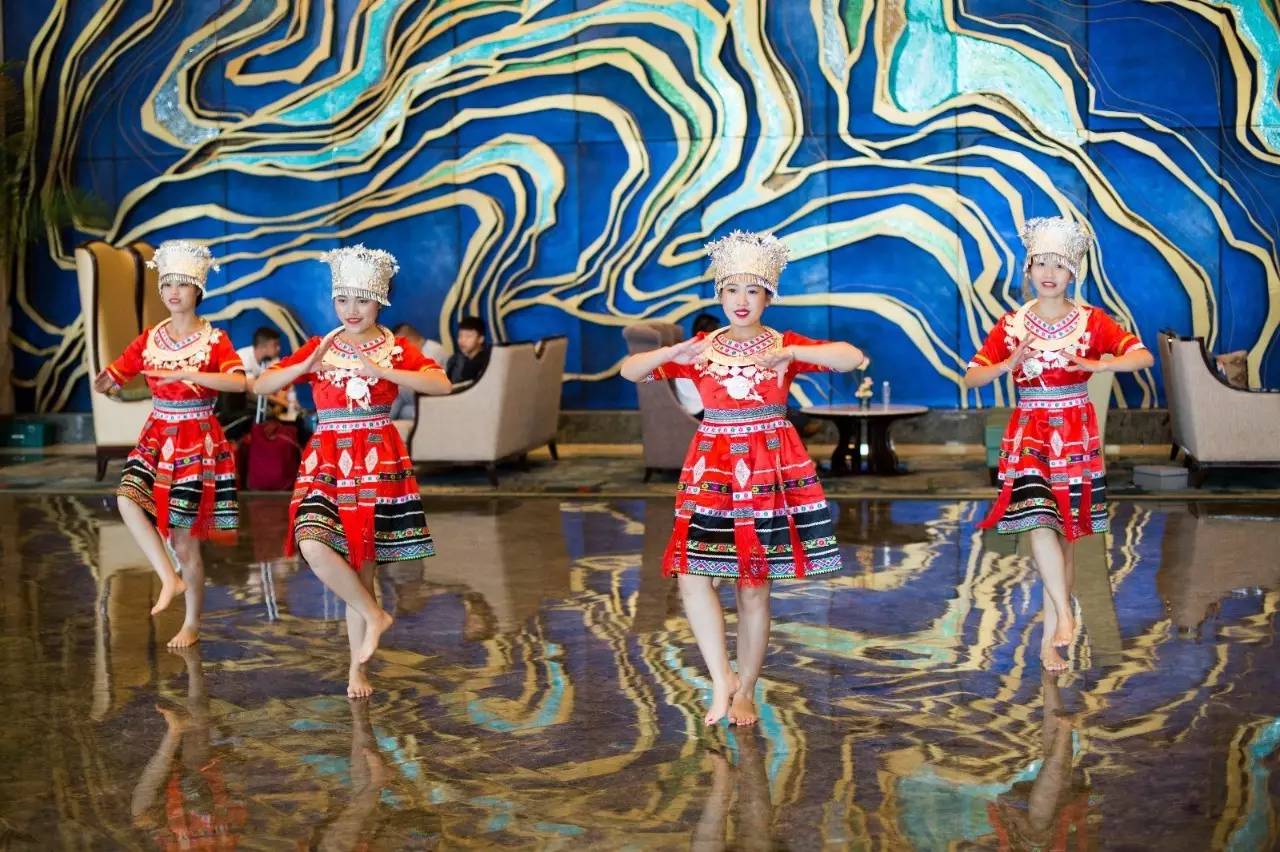 到了酒店,一入大堂,就有身穿壮族服饰、佩戴银饰的姑娘们唱起山歌、赤脚跳起壮族舞蹈,这清亮的歌声一下就消除了旅途的疲惫,这些舞蹈都是农耕劳作时候跳的,看起来简单质朴却很有感染力,让人忍不住和她们一起载歌载舞!