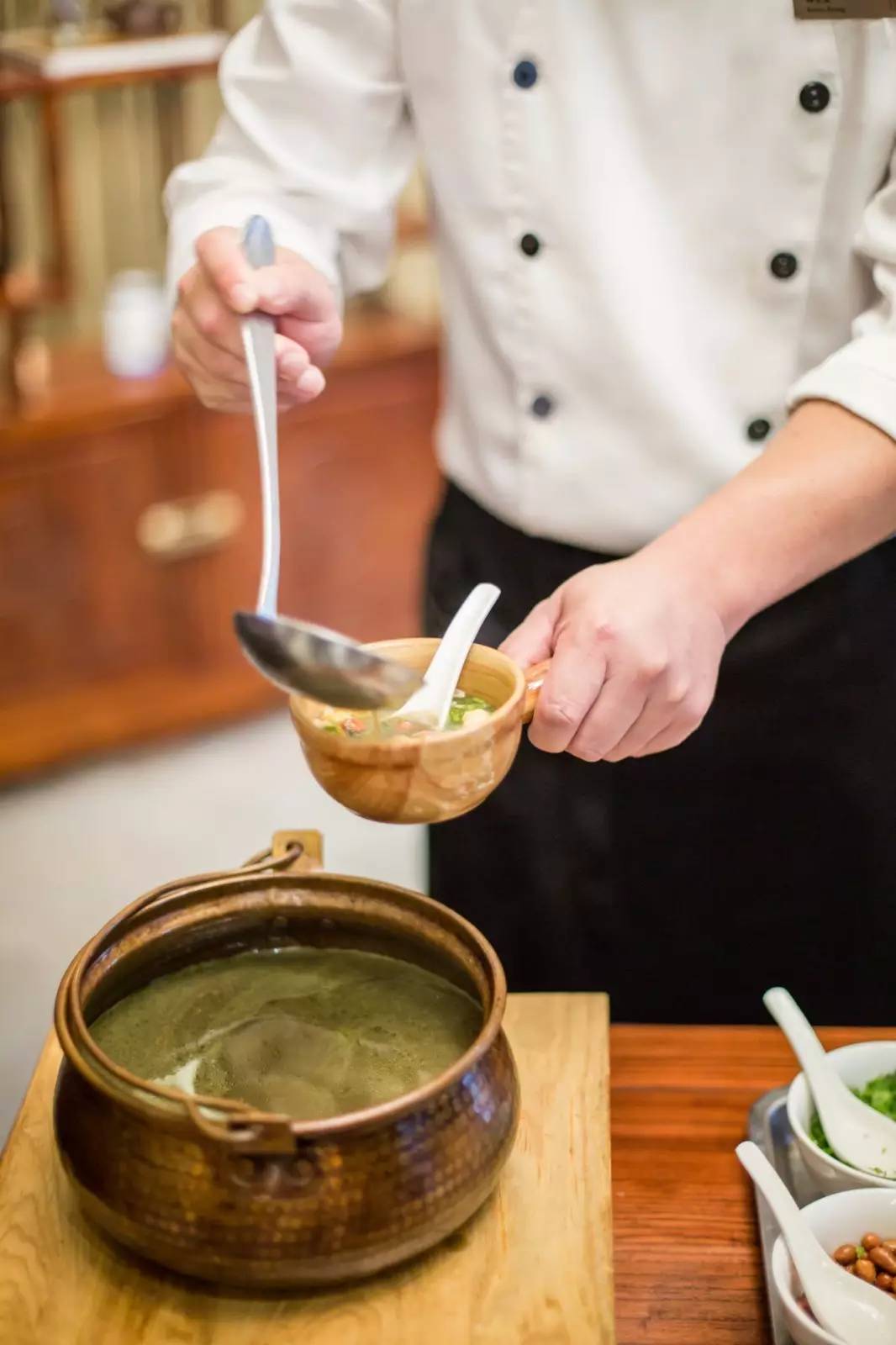 端上桌后,首先闻到一股葱花、香菜特有的香味,进口后初觉是茶叶的清苦,过后便是甘醇鲜香,令人回味无穷。