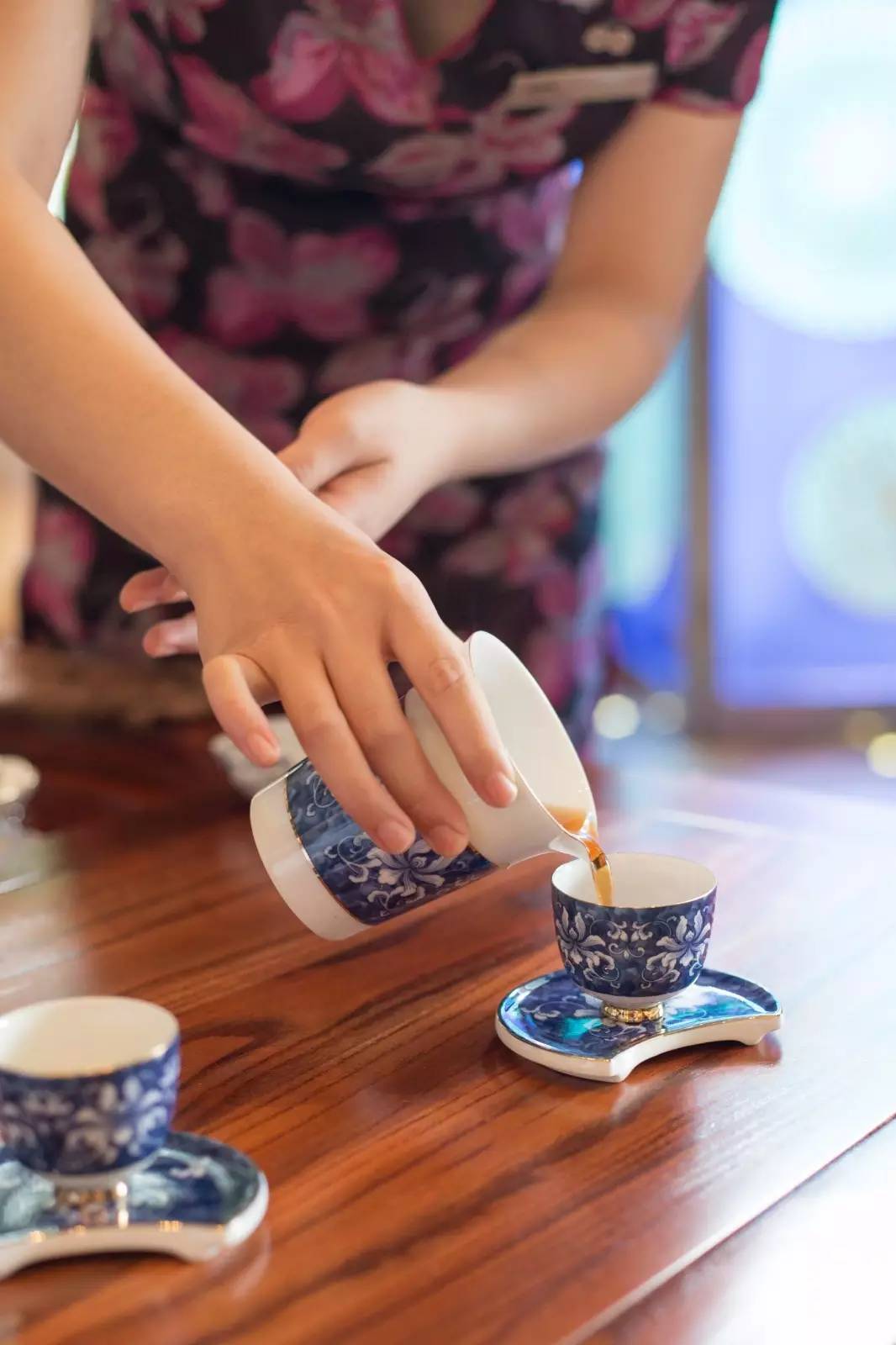中午饭用完,休息一段时间后,我们来到酒店大堂,感受专业茶艺师为宾客们奉上中华茶道。