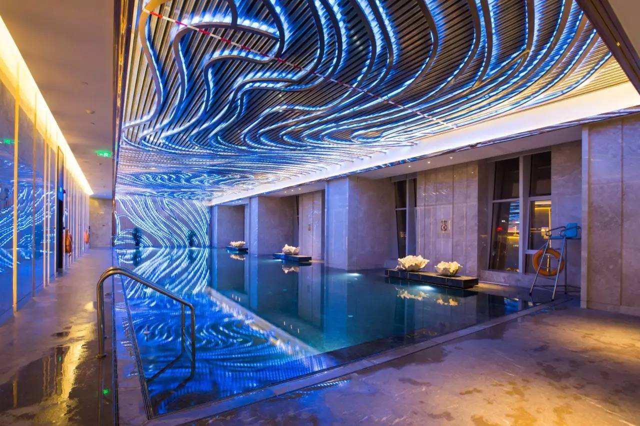 室内恒温泳池延续了大堂“梯田”的设计元素,配以可变色的LED灯源,营造出梦幻琉璃的氛围。