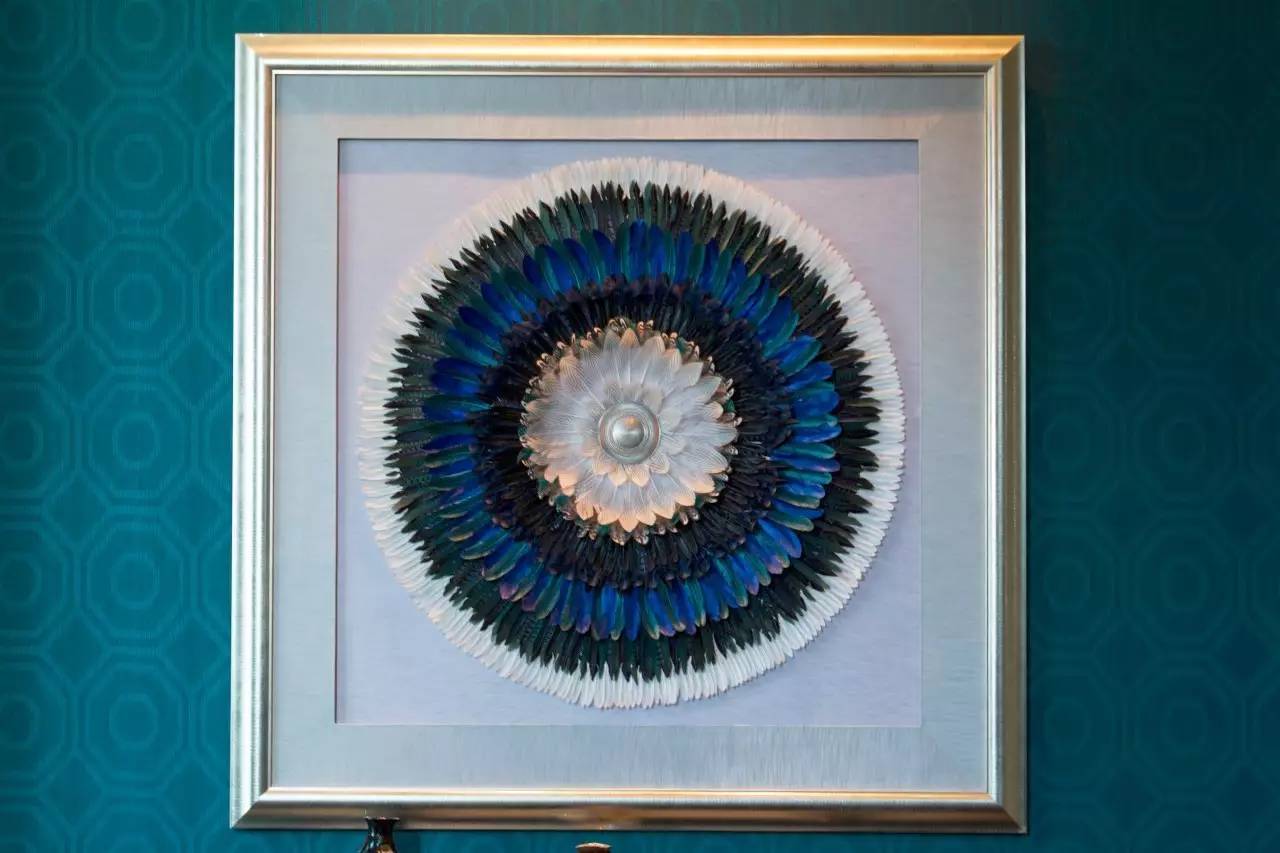 墙上是孔雀羽毛的画作,那一抹惊艳的蓝依旧闪着优雅的光泽。