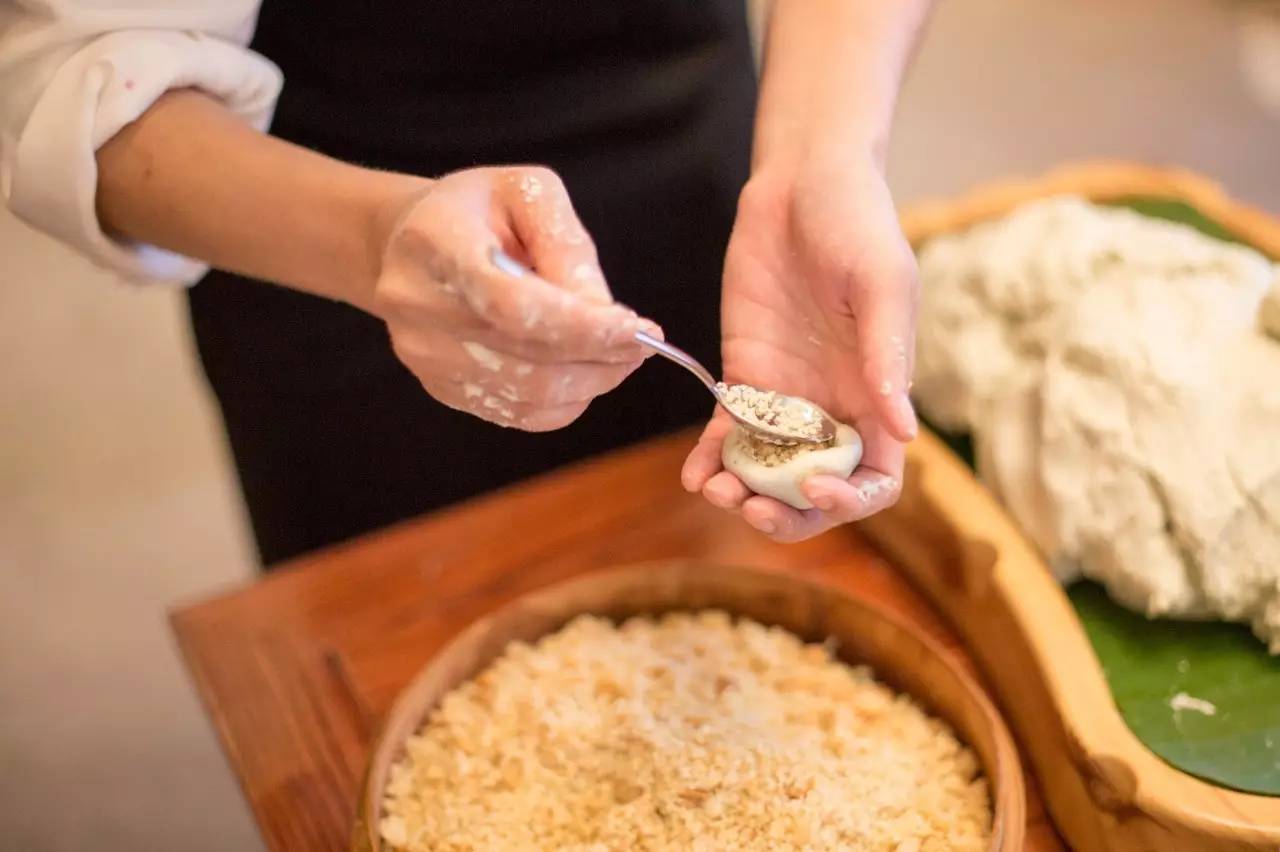 接下来的步骤像包汤圆一样,把面团分好剂子,压扁。包上馅儿。