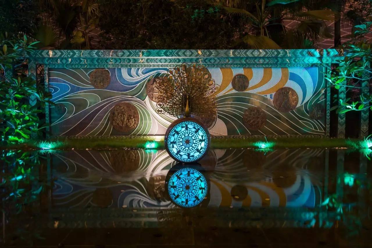 许多铜鼓上会刻上青蛙,因为在壮族人看来,青蛙寓意着多子多福。铜鼓的造型像灵动的明珠镶嵌在酒店的各个角落。