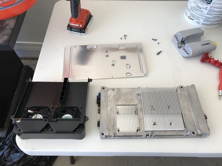 现在,已经能看到AP2.0计算单元裸露在外,就是那个银色的盒子。下面把盒子周围的连接线断开,并拧下四个固定螺丝。就可以将AP2.0处理单元完全拆下来了。