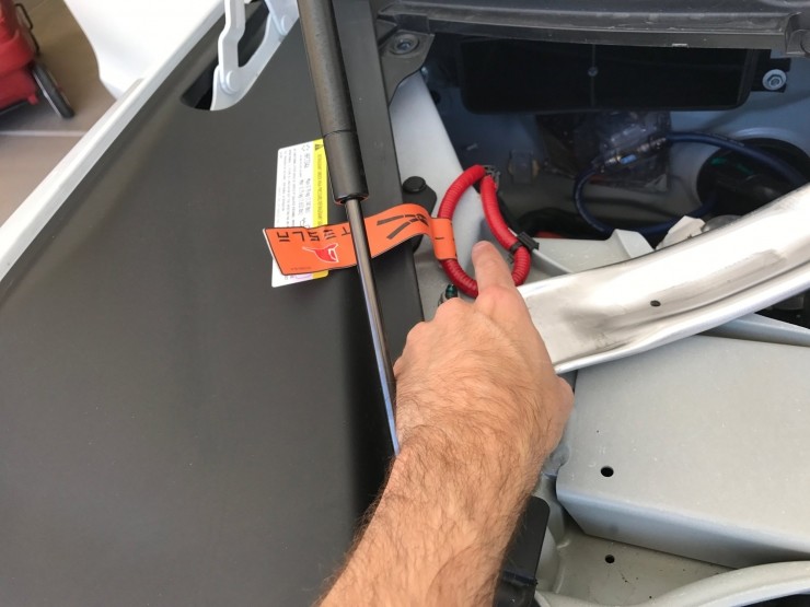 首先,通过汽车主屏幕将电源断开,然后打开车内手套箱(即副驾驶仪表台下方的储物盒),如果不断电储物盒是上锁的。然后,从电池的负极接线柱断开12V供电电源,接着断开应急电源线。