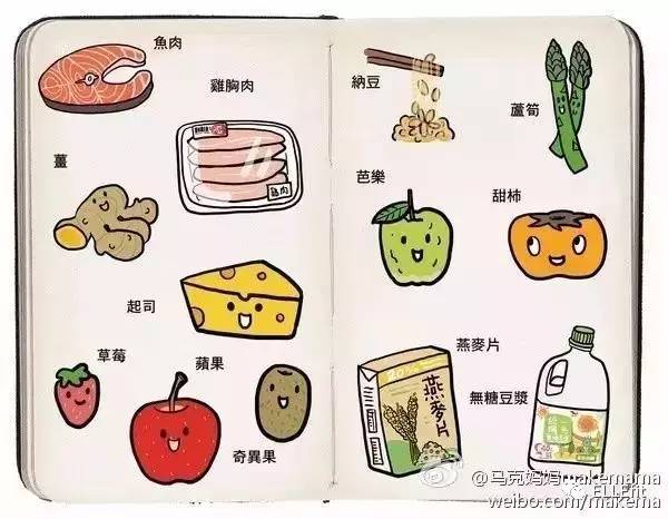 除了运动之外,周翠华非常注重健康饮食,作为一个插画师她还把自己的食谱和经验都画了下来。首先是把食物都换成胖子不喜欢的天然食物,比如新鲜的蔬菜和水果、健康的鸡胸肉和鱼肉等。其次要时刻控制摄入的卡路里,还可以补充一些维他命帮助减肥。