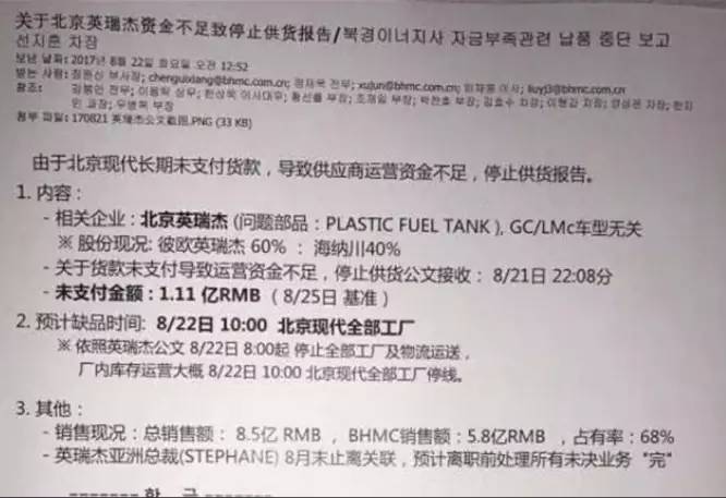 8月23日晚,国内记者获得一份疑似北京现代因拖欠供应商货款,导致供应商运营资金不足,停止供货报告。从停止供货报告内容显示,这家供应商名称为北京英瑞杰,其股份构成为彼欧英瑞杰占60%,海纳川占40%。其中北京英瑞杰全称为北京彼欧英瑞杰汽车系统有限公司,主要经营范围为生产塑料燃油系统,包括燃油箱、注油管、汽油机和柴油机燃油泵等。