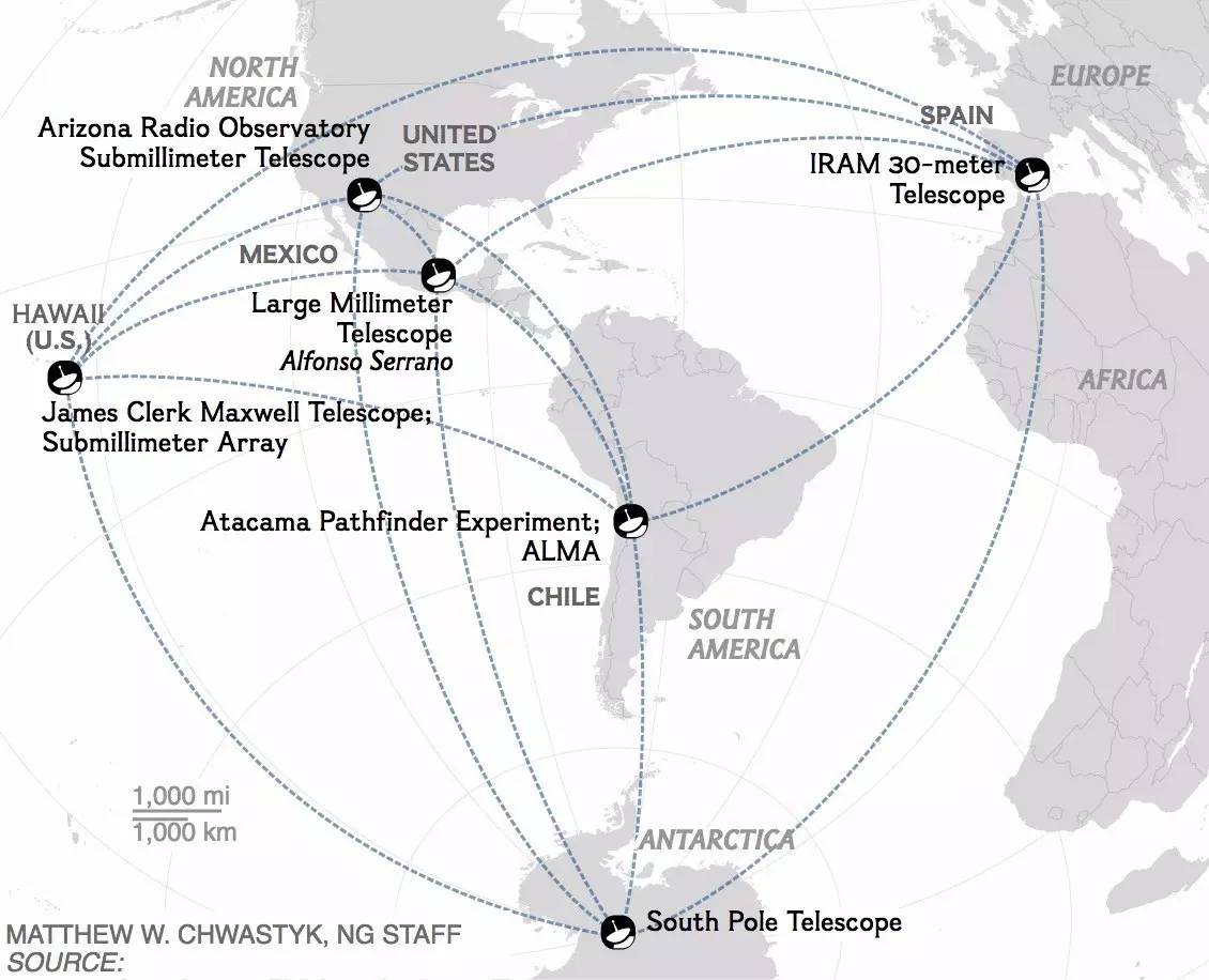 这项工作能取得今天的成果是靠着多年的精心规划和全球合作。不论是位于夏威夷的最高峰,还是坐落于冰冷的南极冻原,世界各地有八个观测站参与其中、共同奋斗。这八个天文观测站的网络相连,创建了一个和地球一样宽的虚拟望远镜。