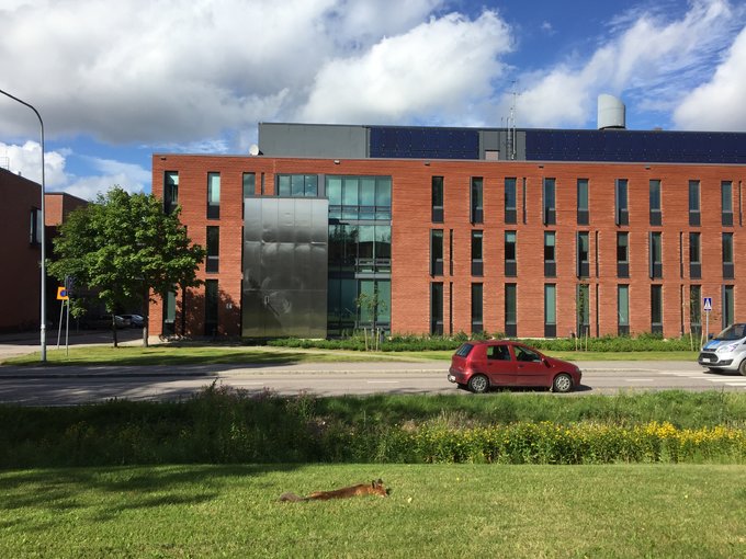 本人去的是阿尔托大学的埃斯波校区,有一天在路上神奇地偶遇一只狐狸平躺在草地里晒太阳,马路对面的草地上横尸一只眼睛睁大的灰兔子,再向右走50米,蜷缩了一只死刺猬……(如下图)莫非兔子和刺猬都是狐狸已经准备好的丰盛晚餐?