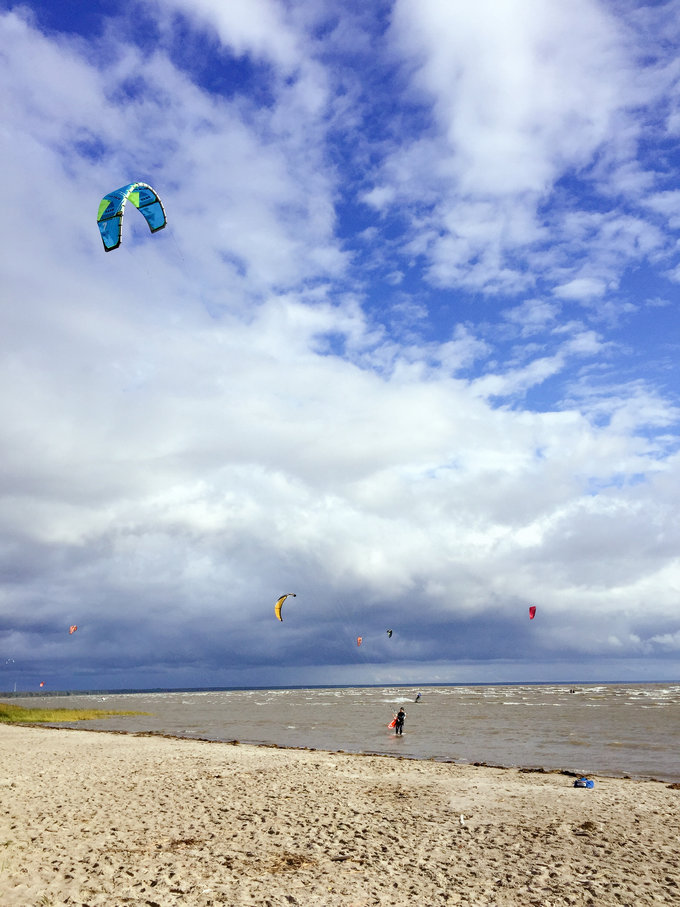 是一个海滨小城,地处爱沙尼亚的南部,有大风大太阳的沙滩。第一次目睹海上风筝冲浪Kitesurf,酷炫极了! 冲浪者随着风浪一跃而起,腾空旋转,当然也有失手的时候,全身扑倒在浪花里了。