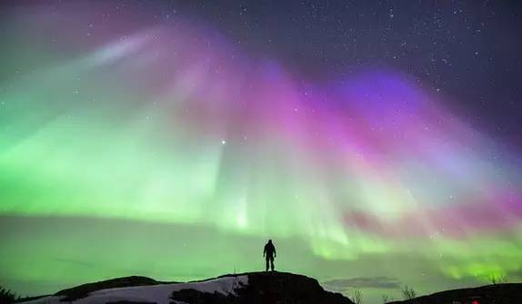 极光总会出其不意地像龙卷风般席卷而来,整片天幕弥漫着奇光异彩,那一刻的感动是任何语言都无法表达的。