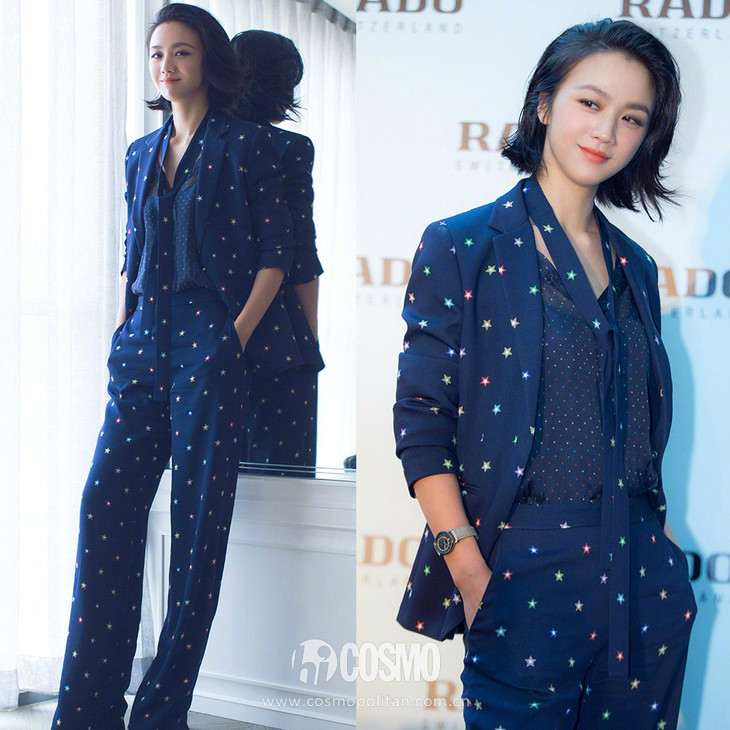 出镜大片的时候,汤唯还演绎了一条偏硬朗的西服裙。光看上半身,以为是有点小个性的露肩西服,不过往下一看,居然是小短裙哦!这种西服裙现在已经屡见不鲜了,在初秋的职场也应该GET起来呢!