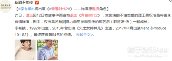 但由于夜店事件,温流退出了《青春时代2》,跟韩艺璃一起宣传电视剧参加的综艺节目也延期了。