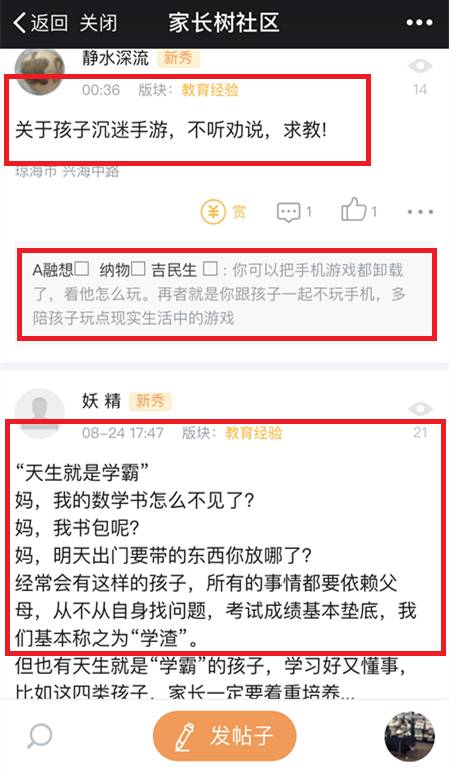 打开之后,可以看到是这样的!这是继家长学习群之后的有一个供爸爸妈妈们交流的开放式平台,家长有任何问题或者经验心得想要分享的,都可以在里面发布☟