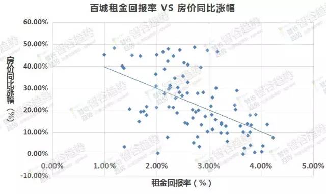 (▲从图中的坐标点分布可以看出,租金回报率越低房价涨幅越高)