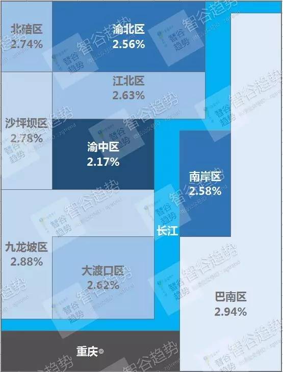 重庆也是“平原分布”,租金回报率在2.5%~2.7%之间。唯有一处比例低至2.17%,是渝中区。我推测这个作为重庆政治中心的行政区也是颇受到投资喜爱的区域,加上商业中心的江北区就在旁边,这两个地区撑起了重庆的房价。而重庆本地人可能就更偏爱外围,比如九龙坡区或者沙坪坝区,这两个行政区也是回报率颇高的地方。