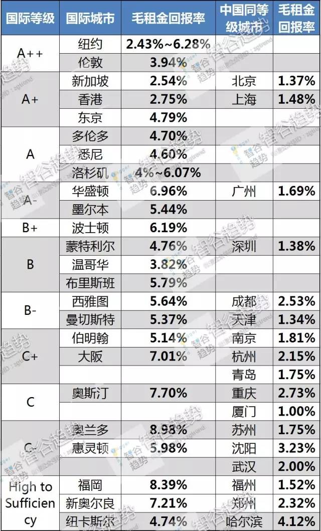 英国罗浮堡大学的全球化和国际城市研究(GaWC),曾按综合竞争力排名把全球大城市分成不同等级,包括中国城市,其对应的租金回报率如下: