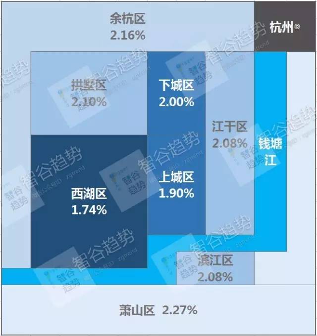 作为江浙地区目前被夸赞最有前途的城市,杭州的租金回报率分布情况与上海、重庆相似,比较平均,唯有一处(西湖区)较低。杭州的租金回报率分布在1.9%~2.2%之间,比较低的西湖区是房价高所导致,平均房价高于其他行政区。