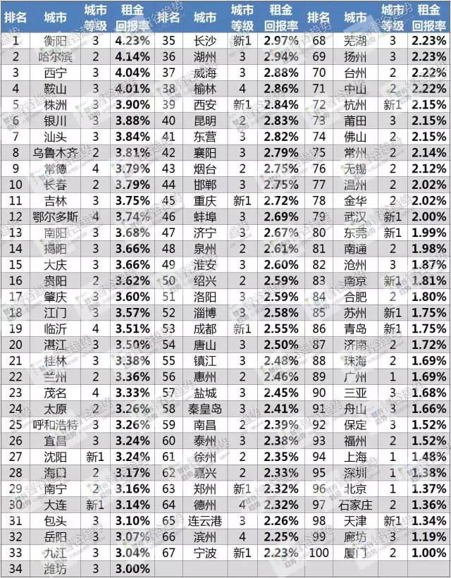 先呈上这100个城市的租金回报率总榜排行。