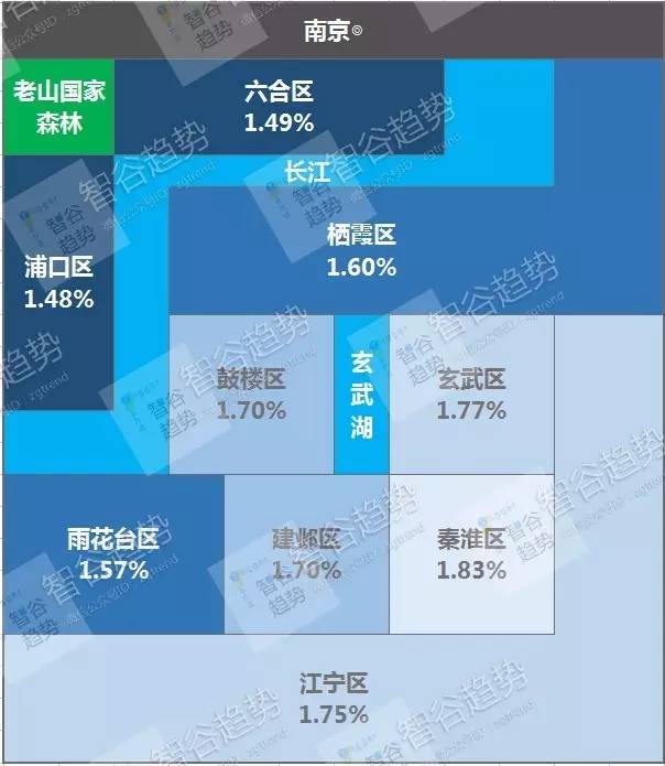 南京租金回报率较低的两个区是浦口区和六合区,而更靠东南的几个区租金回报率都在1.7%以上。六合区和浦口区并不是南京租金\房价最高的区域,两个区价位甚至可以说是倒数,租金回报率之所以低,是因为房租房价两个数的比值都较低所致。