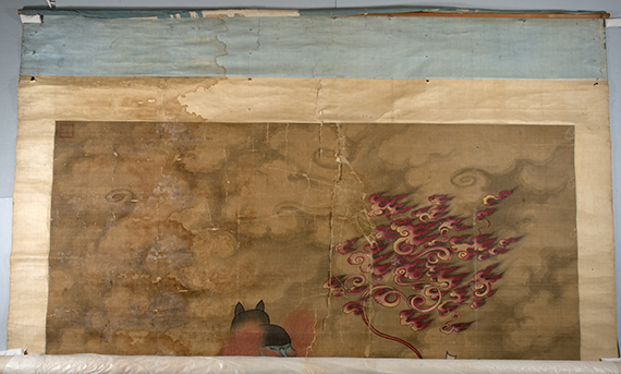 在这些修复的对象中,有一件中国明代(16世纪)的道教人物绢画《道教雷部辛天君画像 》。这幅《道教雷部辛天君画像》尺寸巨大,画心高约3.8米,宽2.5米多。如果算上装裱,整体高接近5米,宽接近3米。