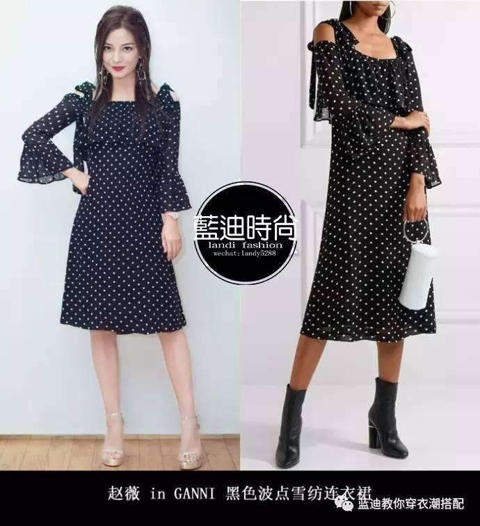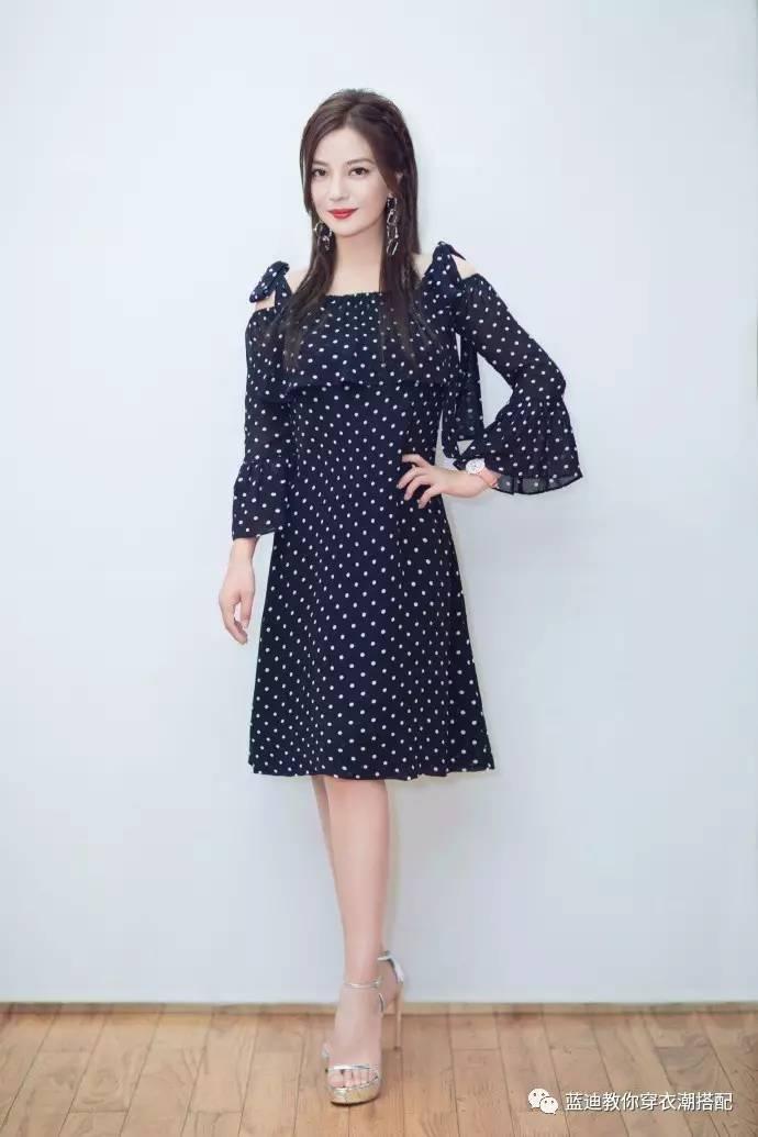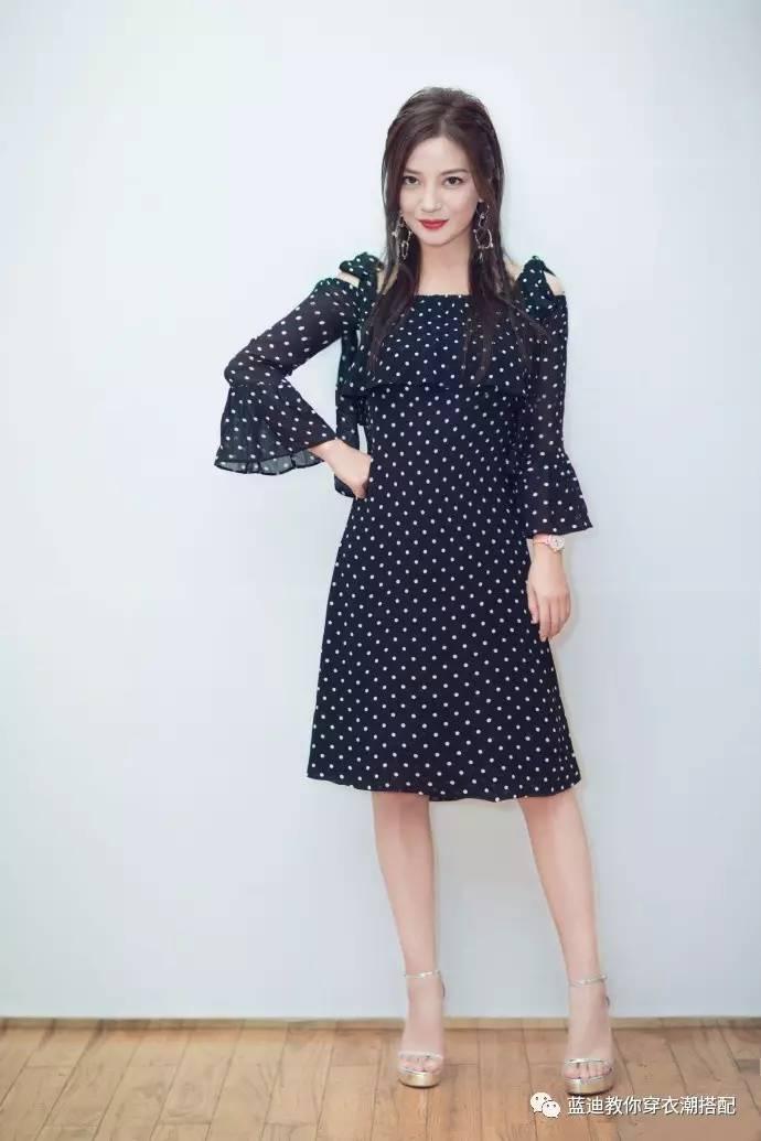 近日,@赵薇 出席活动,身穿GANNI 黑色波点雪纺连衣裙搭配Stuart Weitzman银色细带高跟鞋。灵动俏皮的蝴蝶结肩带和喇叭袖,与略带夸张的MARNI耳环呼应,知性气质又不失时尚感。