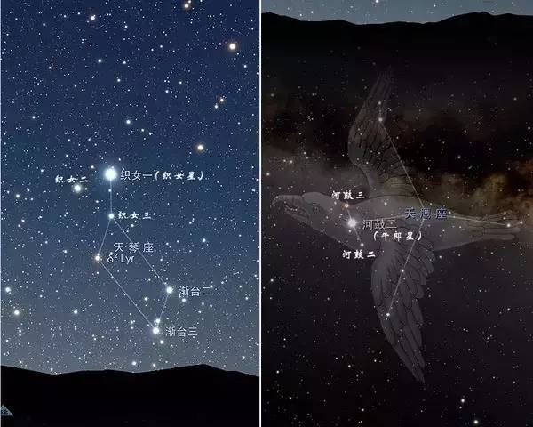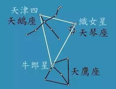 在银河中间的那颗是天津四,银河西北方的是织女星,东南方的就是牛郎星了。如果你分不清东南西北,你可以把这个三角形看作是一个直角三角形,那织女星便是构成直角的星星。